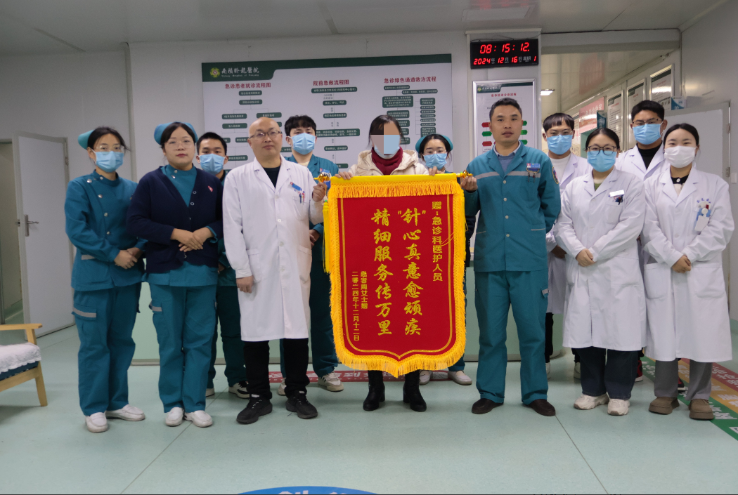 康复出院患者的周女士来到我院急诊医学科,将写有“针心真意愈顽疾,精细服务传万里”的锦旗送至我院急诊医学科医护团队手中并连声道谢:“感谢贵院医护团队的精湛医术和优质服务,让我重获新生,感激不尽!”